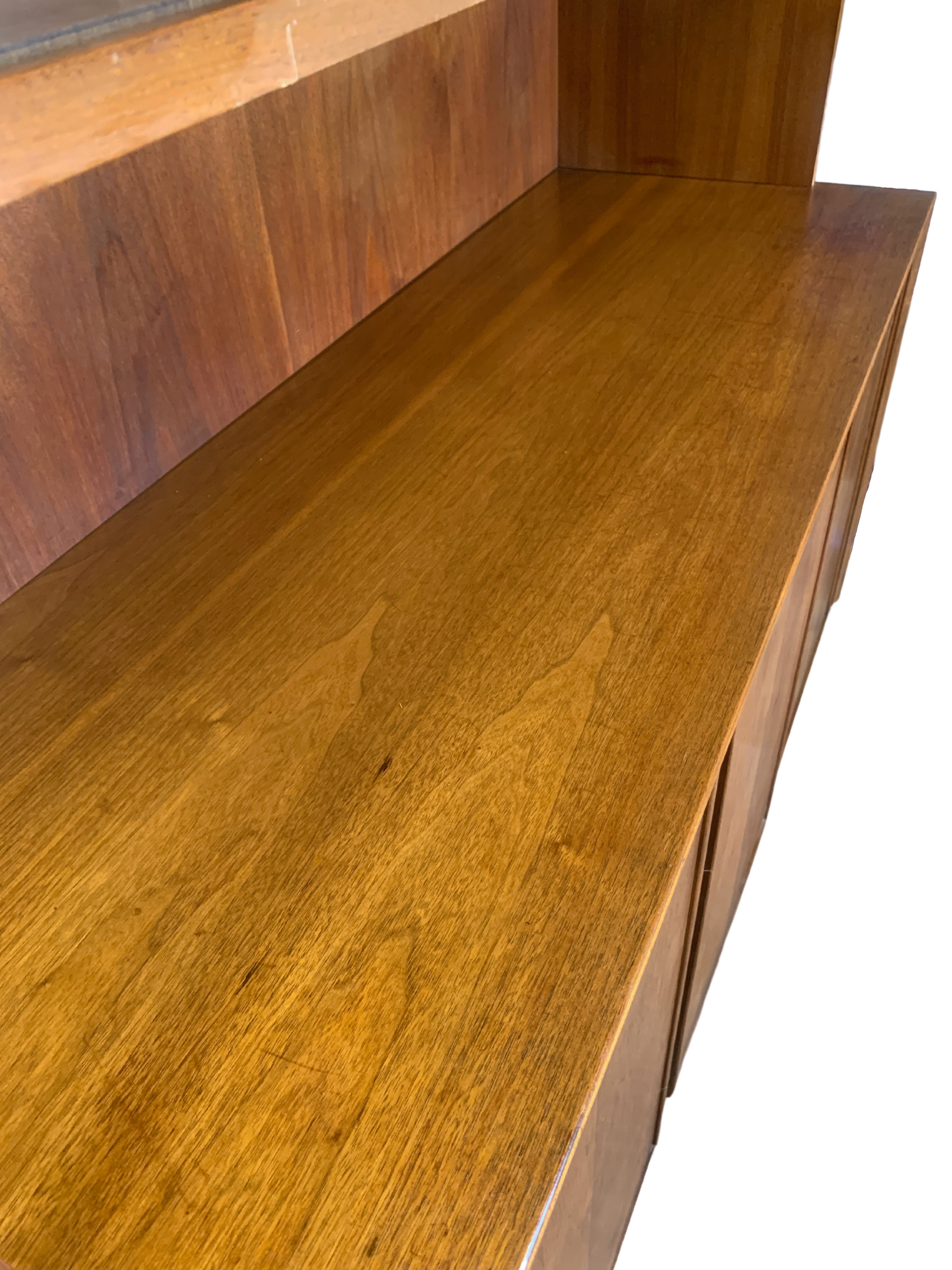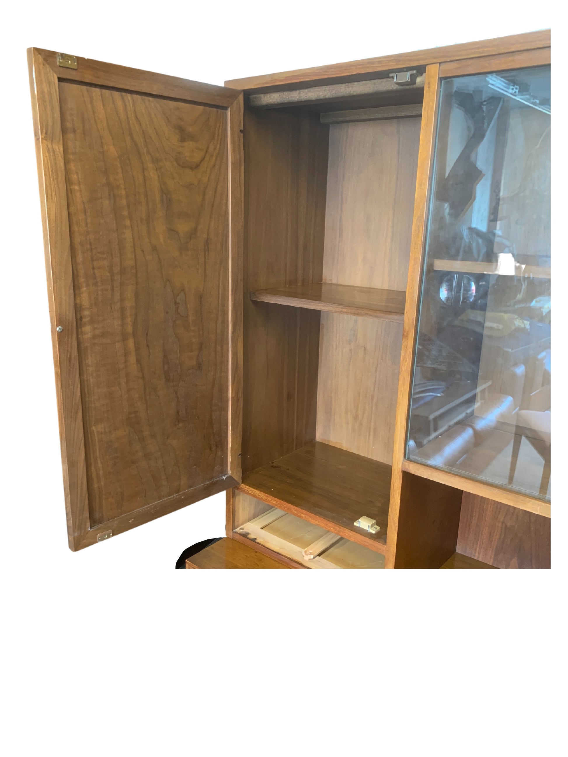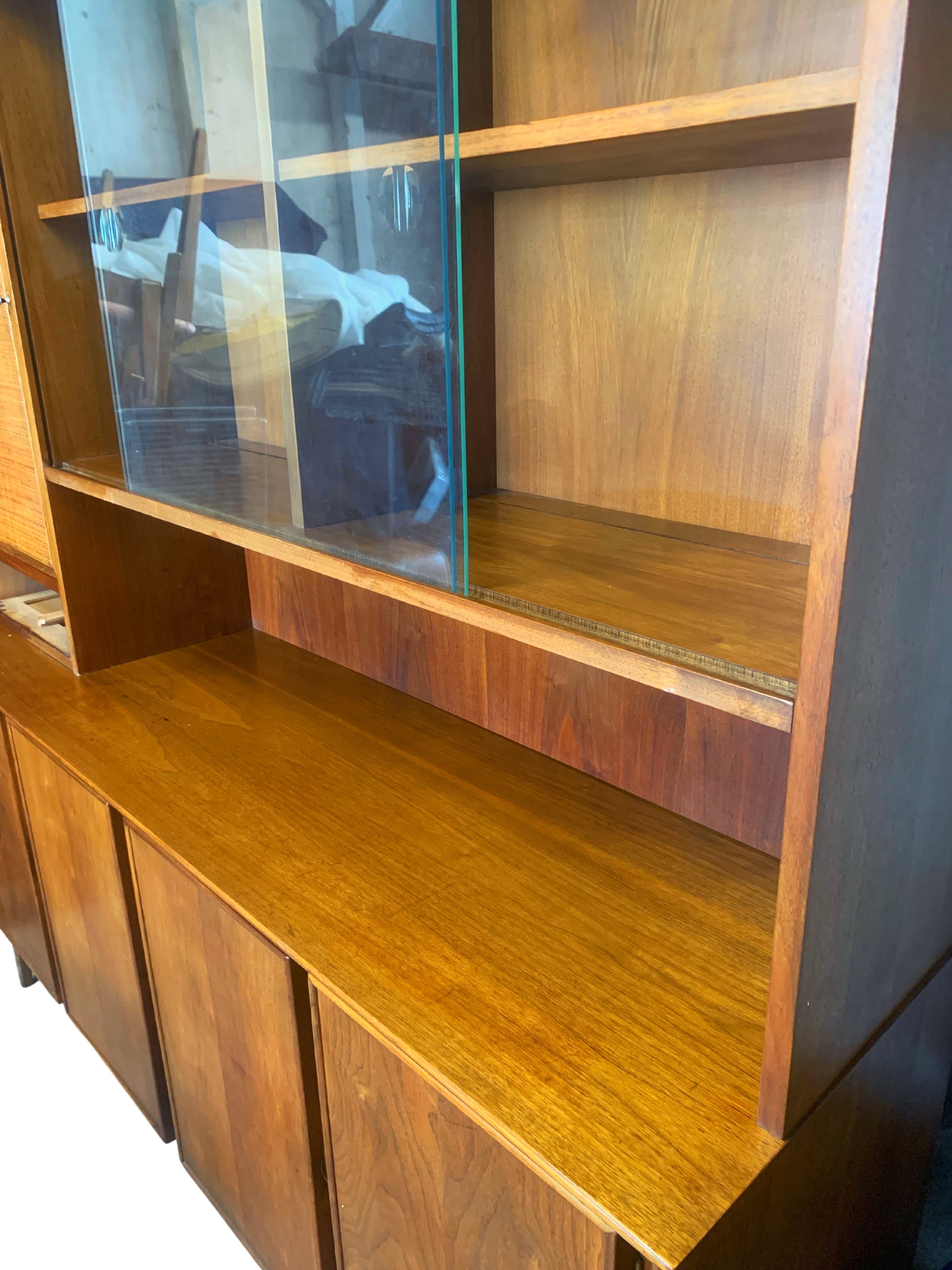 Beautiful mid century walnut American of Martinsville China Cabinet Hutch in wonderful original condition. The hutch is two solid-pieces featuring display shelving on the upper right with glass sliding doors and cabinet with a storage drawer on the top left. The bottom portion features a double cabinet with shelving and two storage drawers.