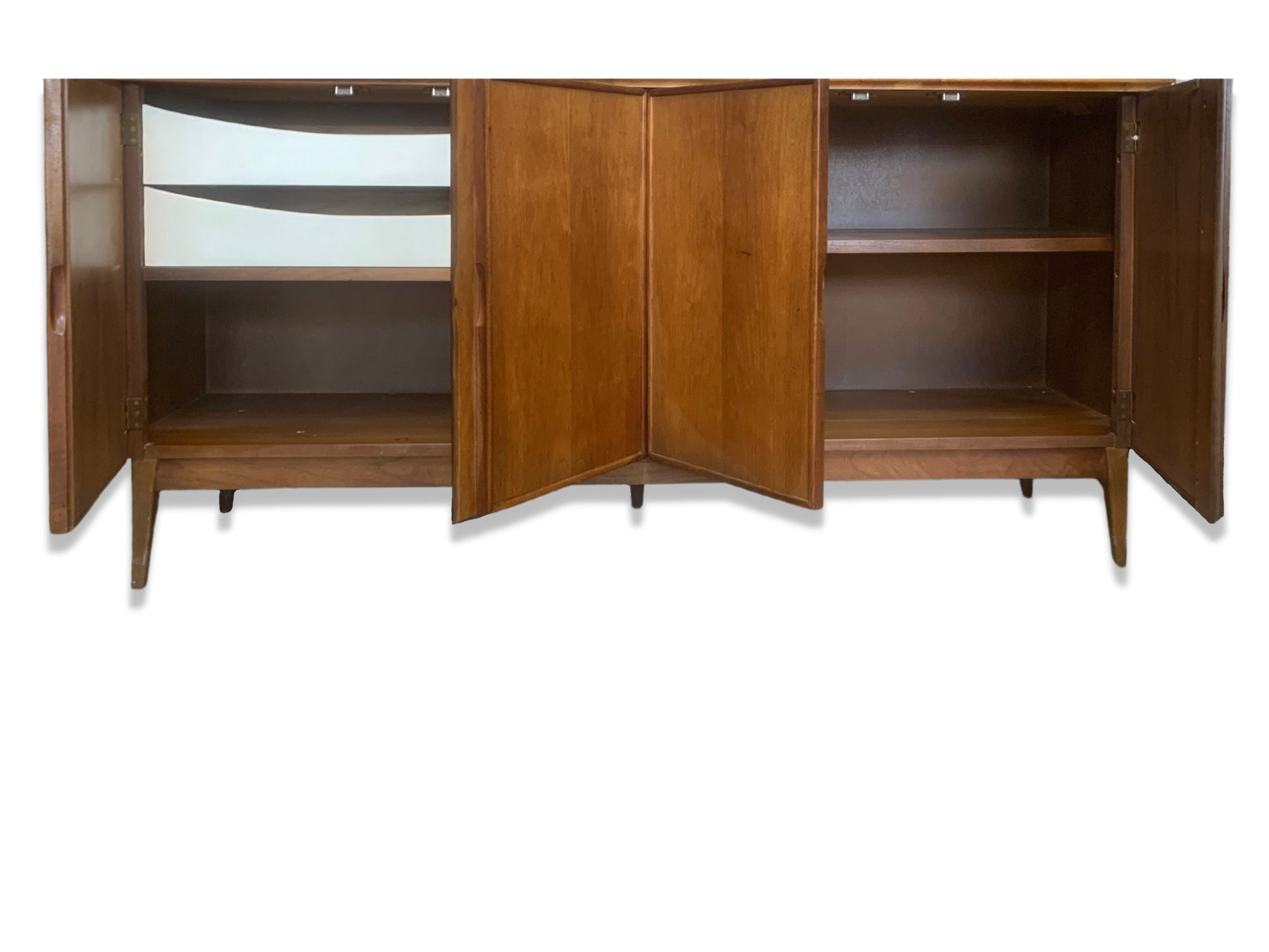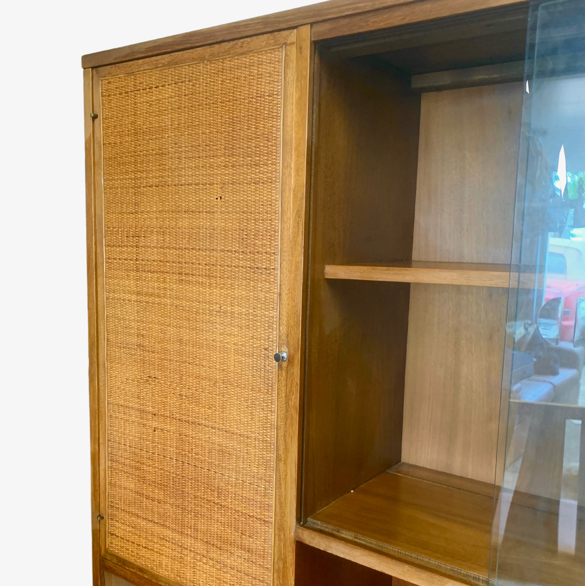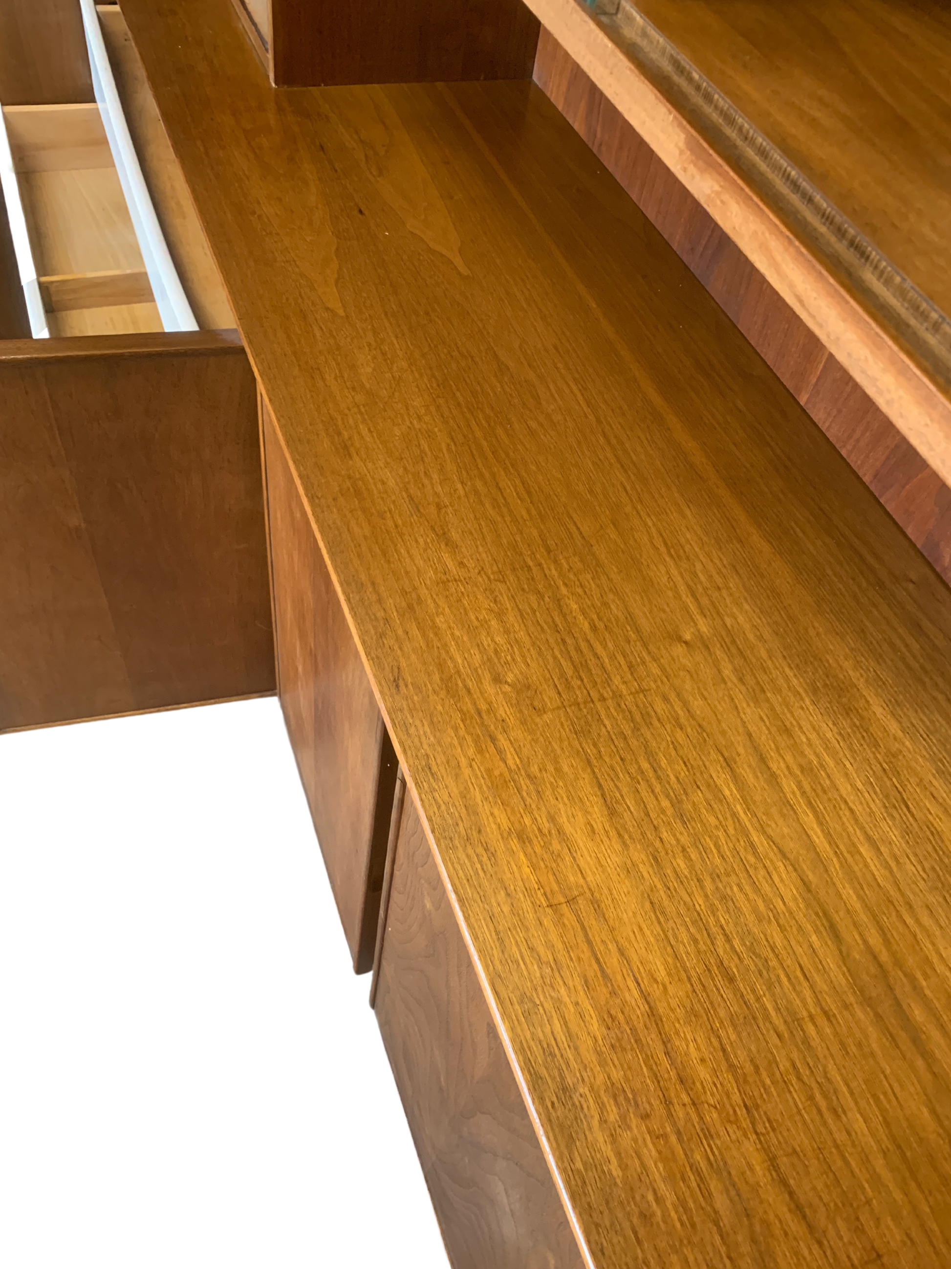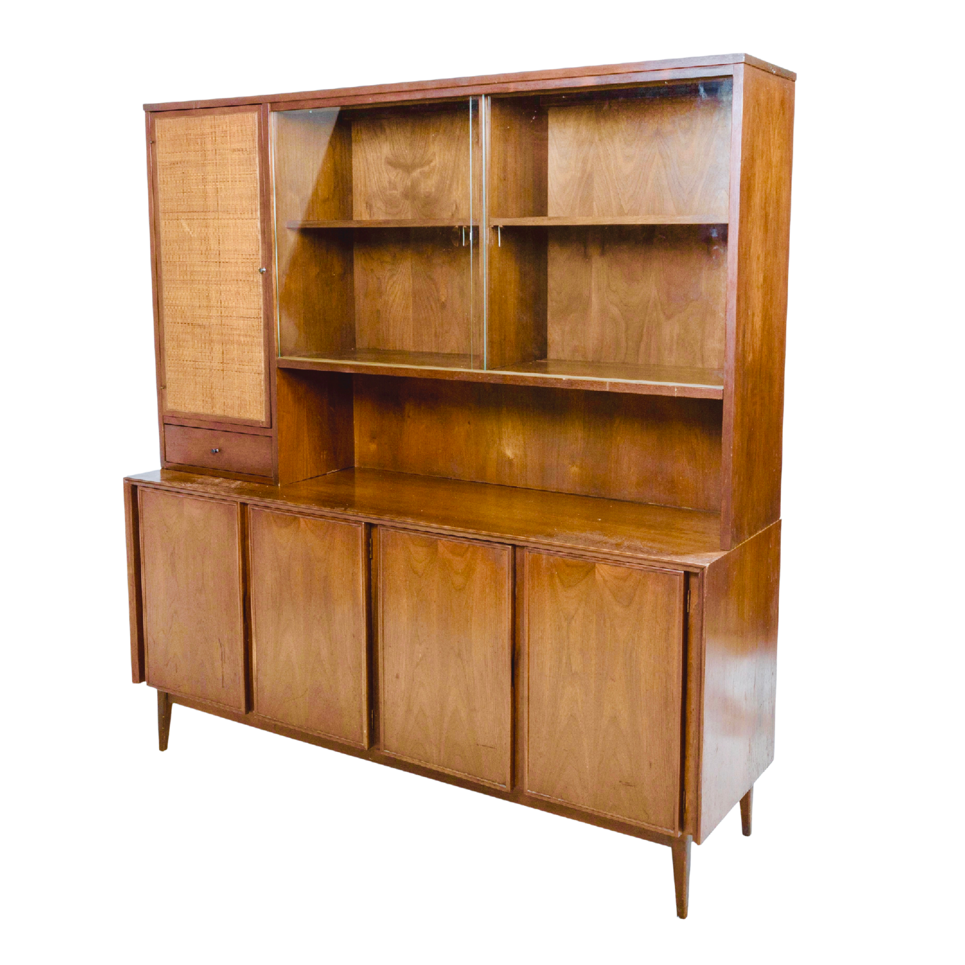 Beautiful mid century walnut American of Martinsville China Cabinet Hutch in wonderful original condition. The hutch is two solid-pieces featuring display shelving on the upper right with glass sliding doors and cabinet with a storage drawer on the top left. The bottom portion features a double cabinet with shelving and two storage drawers.