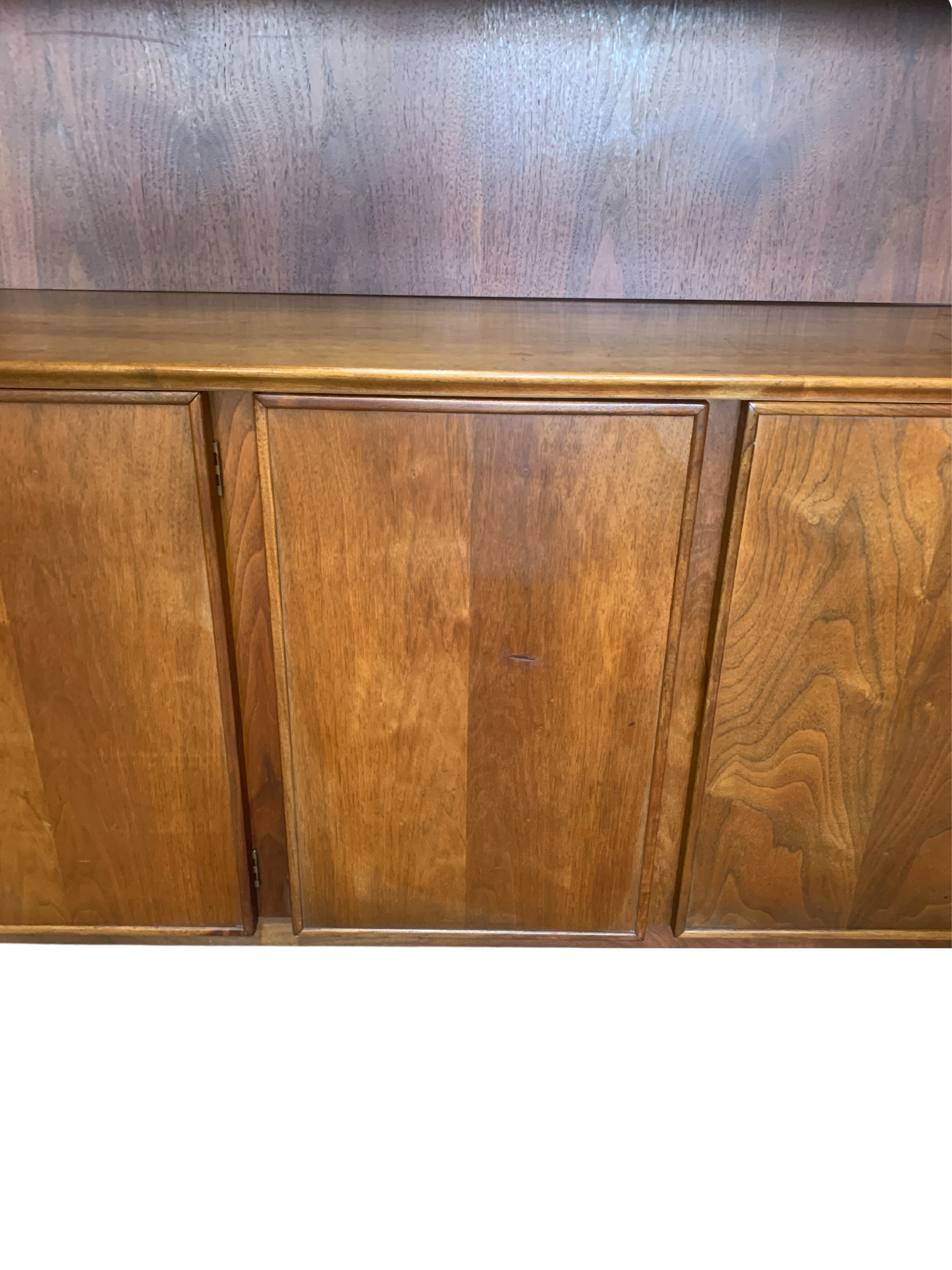 Solid walnut in classic Danish style, this piece doubles as a shelving/storage and display. This piece is in excellent vintage condition with only very minor wear from age.