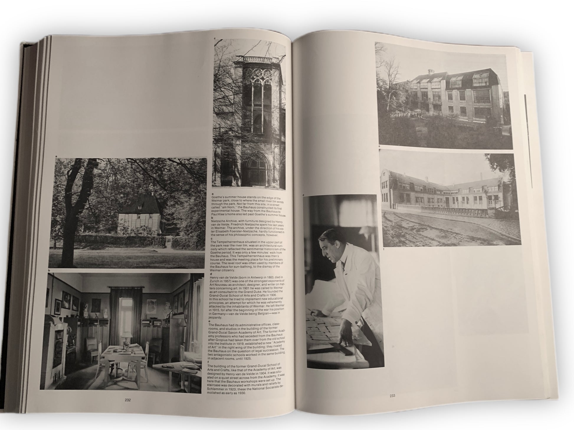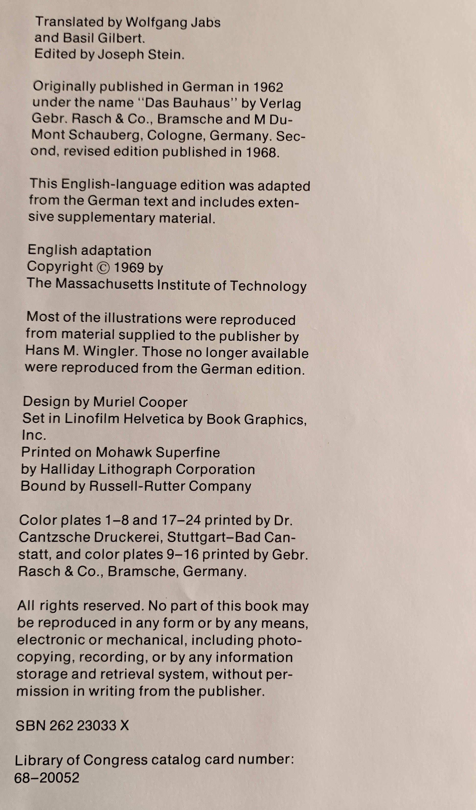 Includes a roster of all students during the years 1919-1932 and bibliography listing all associated programs, statutes and publications by and about the movement, and work by all the Bauhaus faculty including Walter Gropius, Paul Klee, Wassily Kandinsky, Laszlo Moholy-Nagy, Marcel Breuer, Herbert Bayer, Josef Albers, Lyonel Feininger, Oskar Schlemmer, Hannes Meyer, Mies van der Rohe and others.
