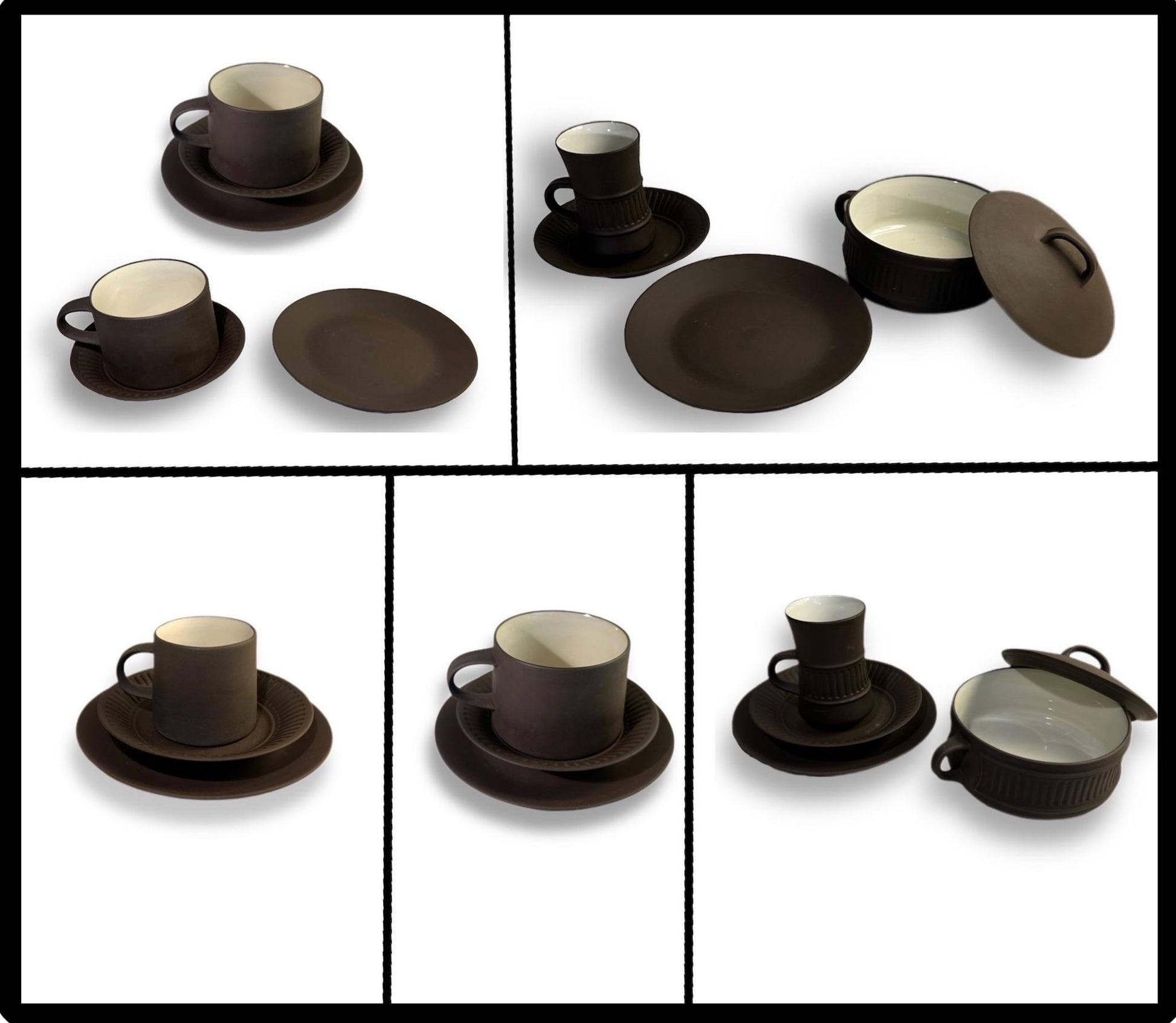 Set can be configured in dozens of ways to serve just coffee, espresso, a light breakfast, or a full spread complete with cocotte for each. Just a few possibilities pictured in the photos!