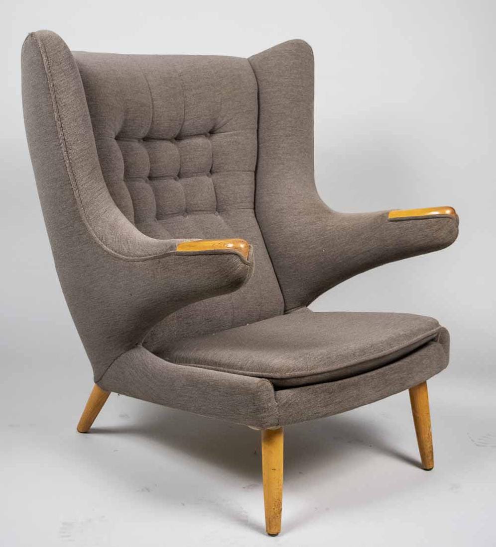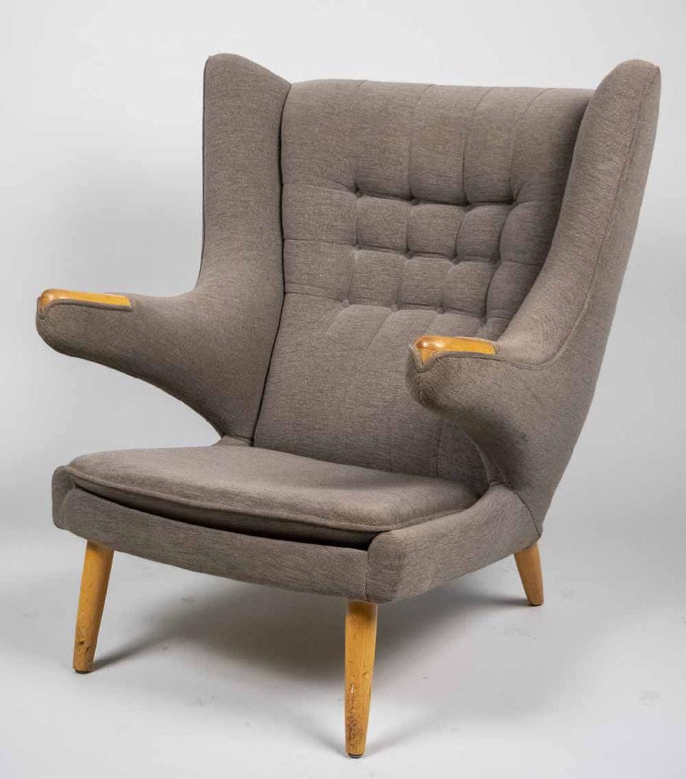 The wingback Papa Bear chair, also known as the Teddy Bear chair, has two outstretched arms with wood detailing once described by a critic as “great bear paws embracing you from behind”.