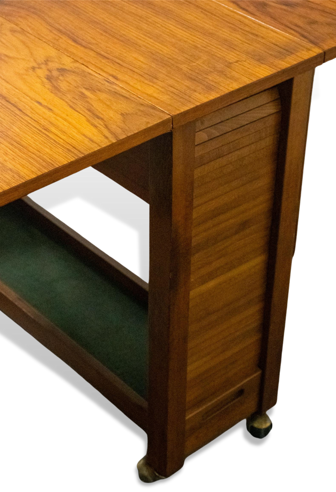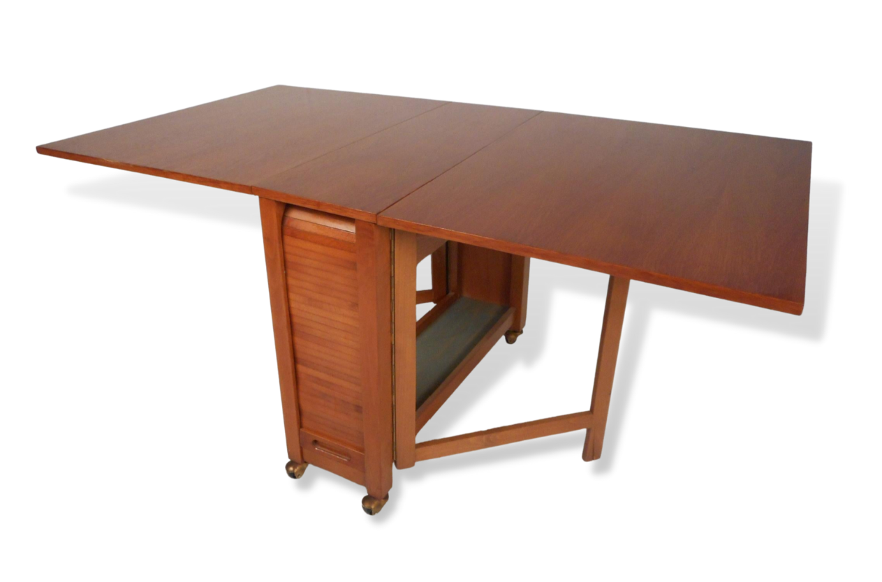 The table has a tambour door that rolls up to store folding chairs, servingware, or games as well as a small drawer for flatware.