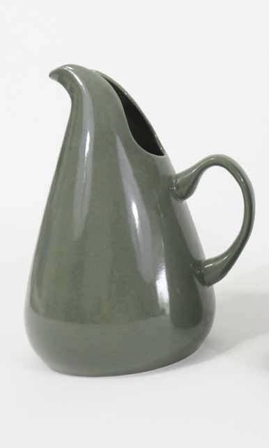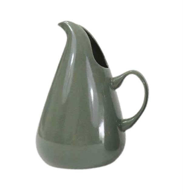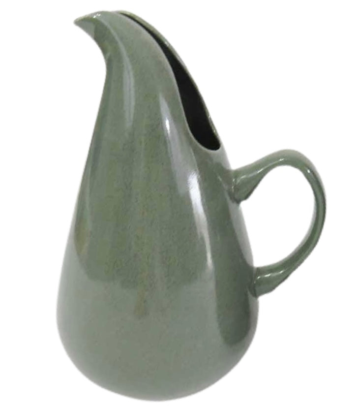 This vintage Russel Wright pitcher in Green Cedar is a stunner. Made by the Steubenville China Company for the American Modern collection by Russel Wright the large ceramic handled pitcher is incredible in this difficult to find shade of green.