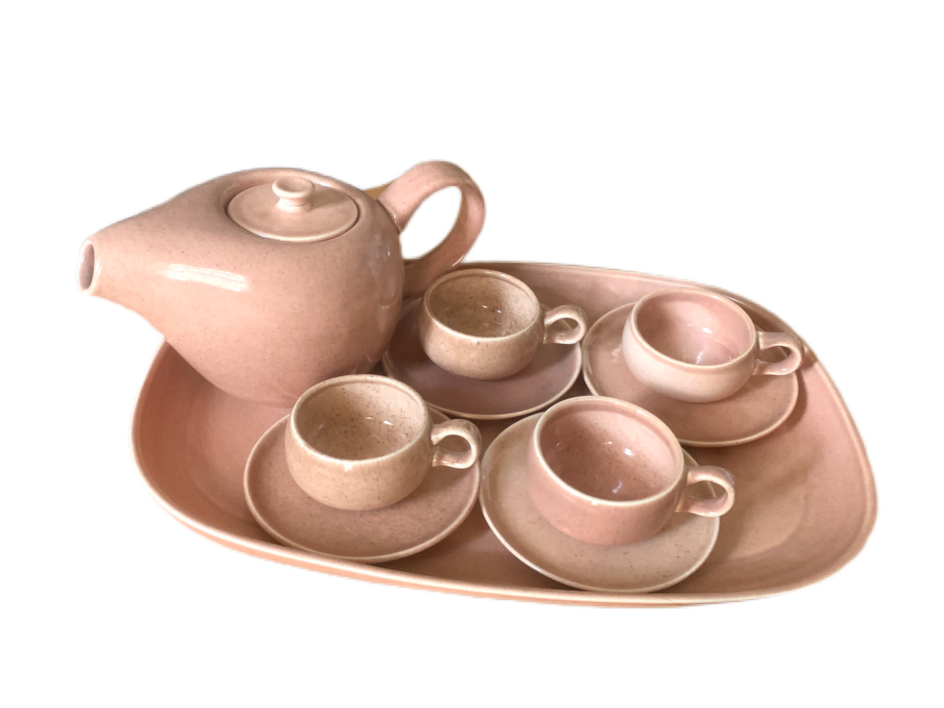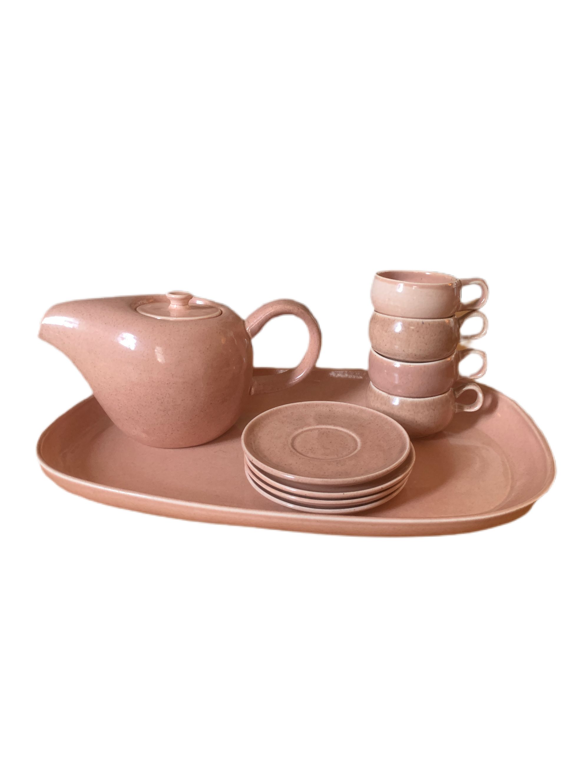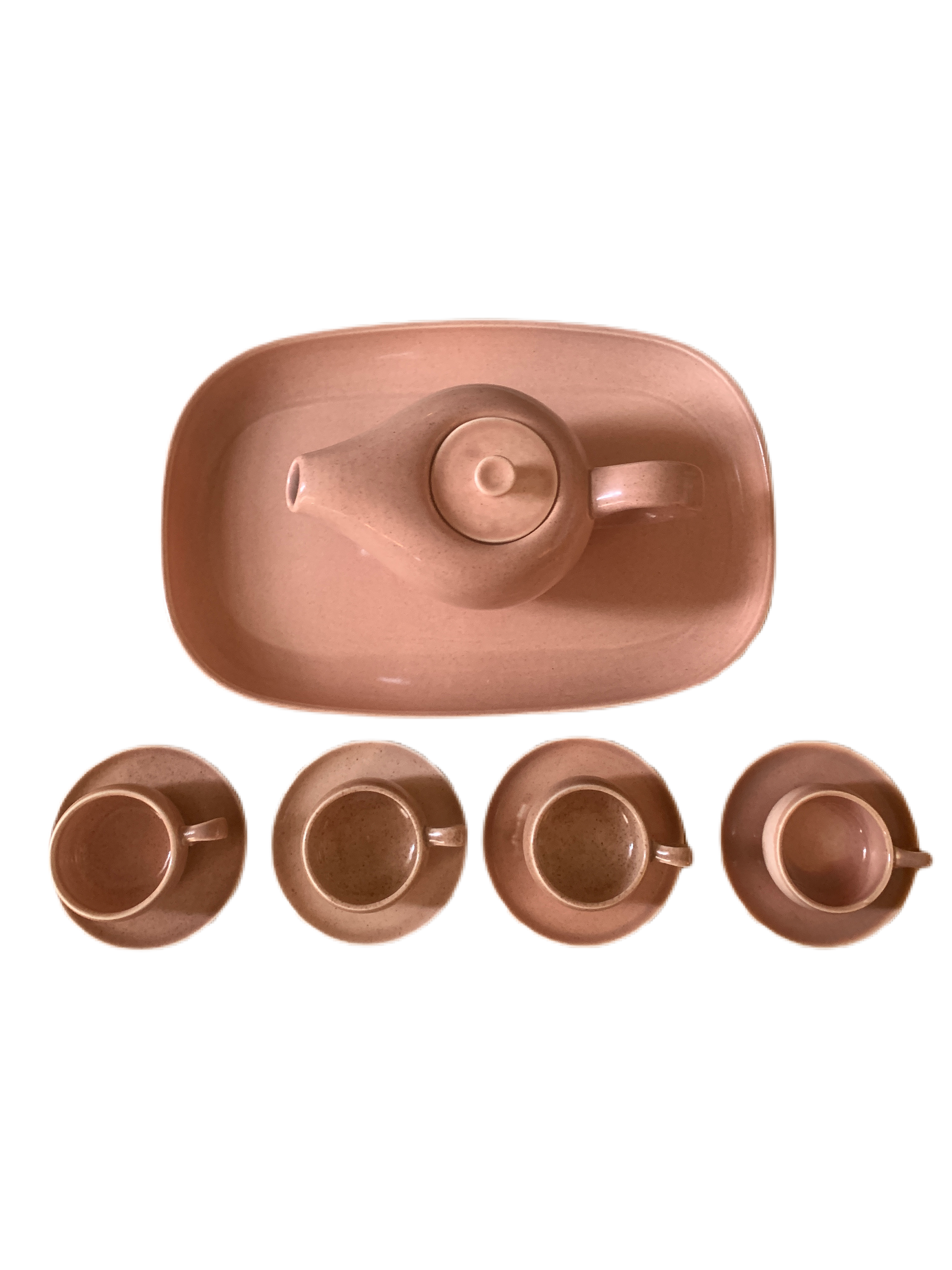 Set is comprised of the small coffee pot (4" x 8.5" and 2 cup. capacity), rectangular serving platter (13"), four demitasse cups (1.5” h x 2.5” dia) and matching saucers (4.5”) in a lovely shade of speckled coral.