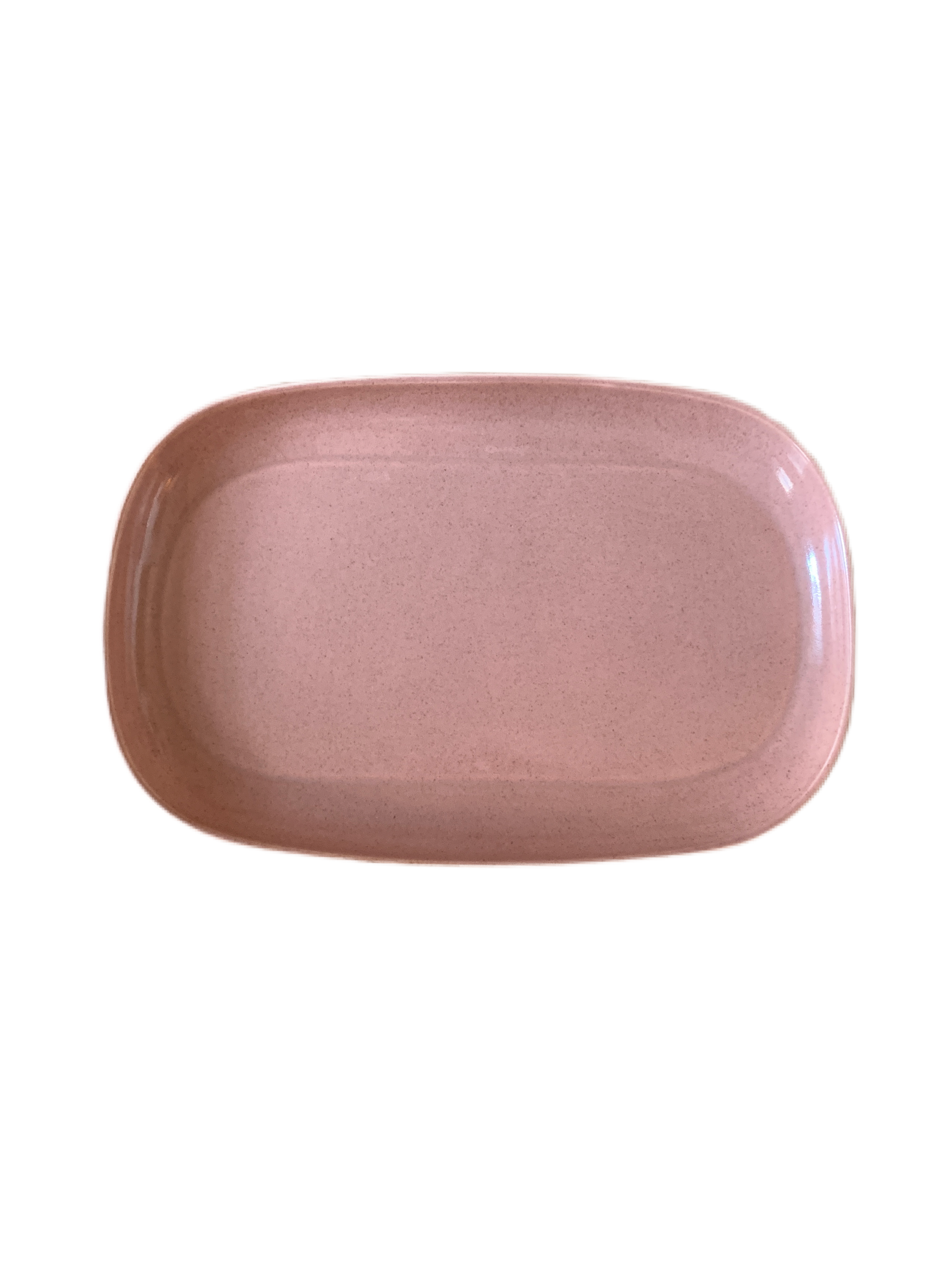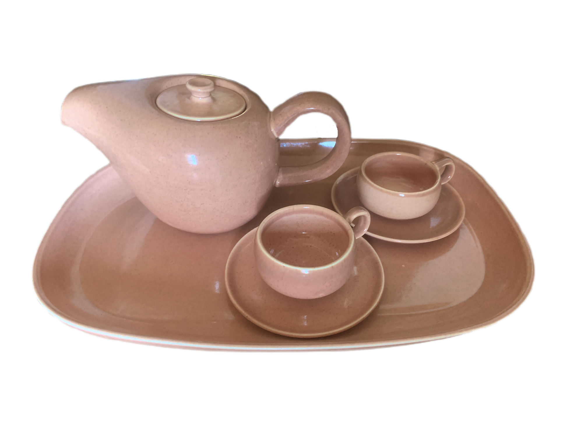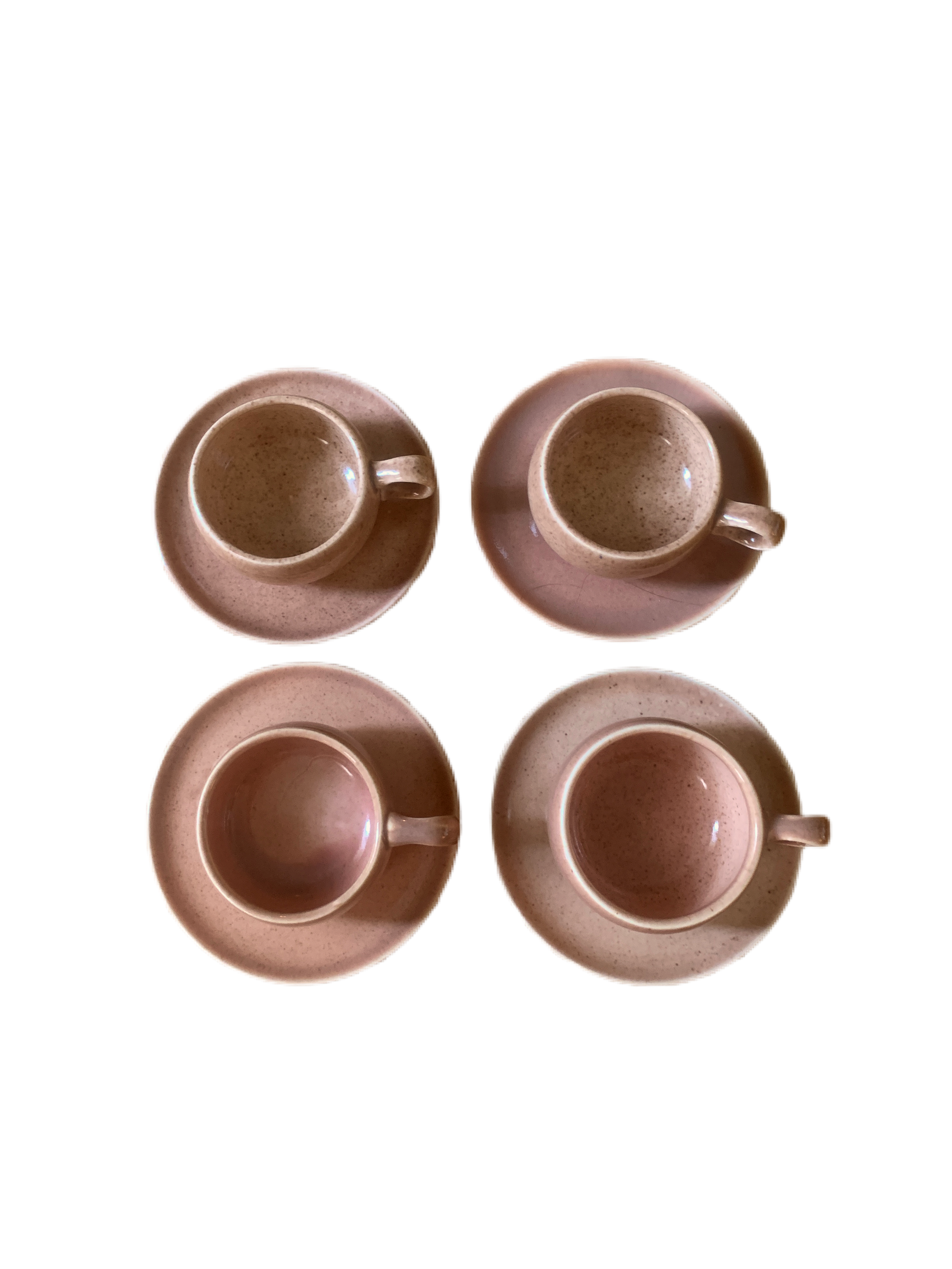 Set is comprised of the small coffee pot (4" x 8.5" and 2 cup. capacity), rectangular serving platter (13"), four demitasse cups (1.5” h x 2.5” dia) and matching saucers (4.5”) in a lovely shade of speckled coral.
