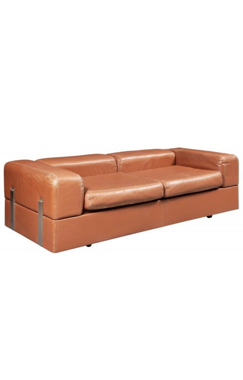 Made in Italy imported by Stendig of fabulous cognac leather with stainless steel joints, the 711 is set on casters for maximum flexibility of configuration and convenience. Easy to open up; keep a side table down for lounging, or fold down all sides to convert into a bed.